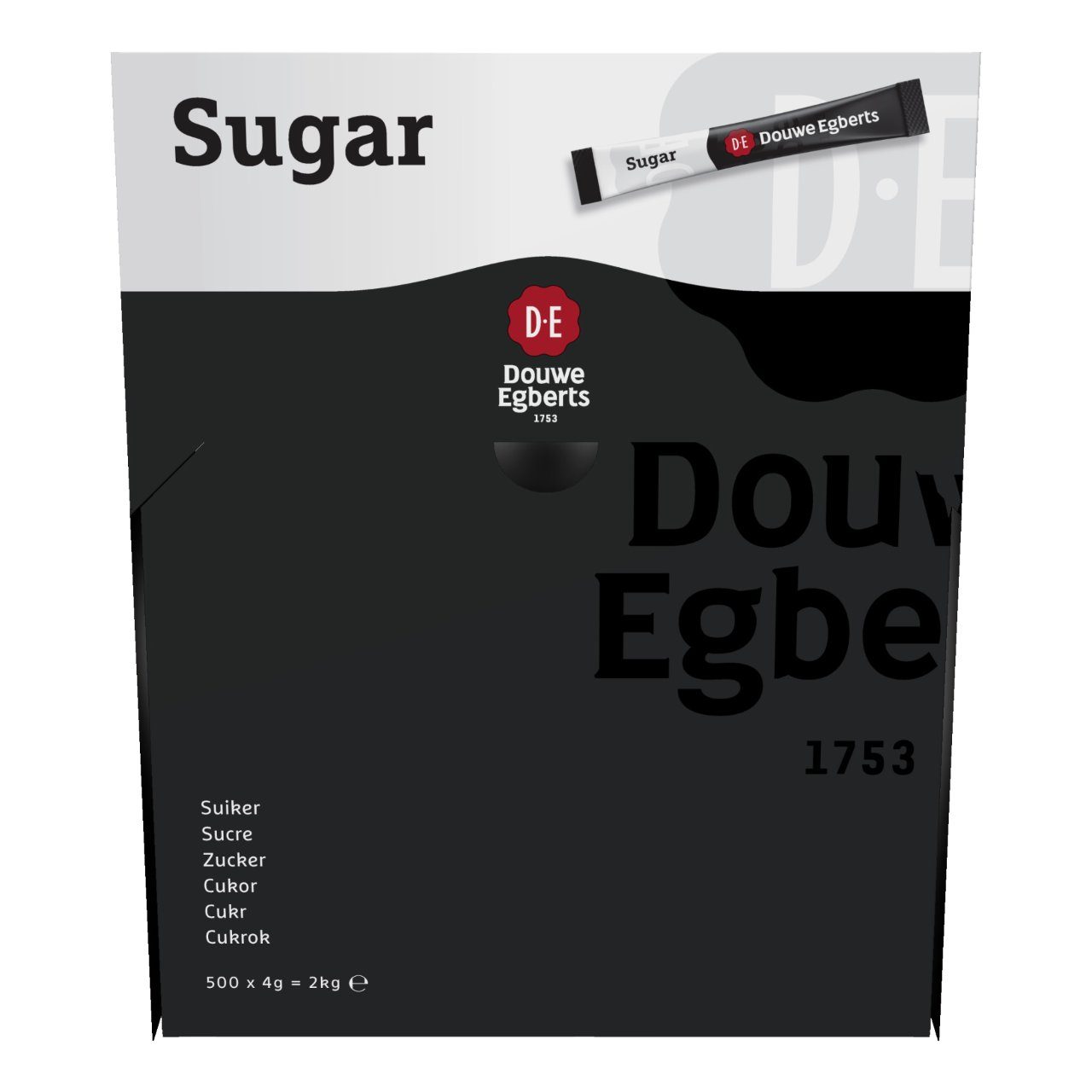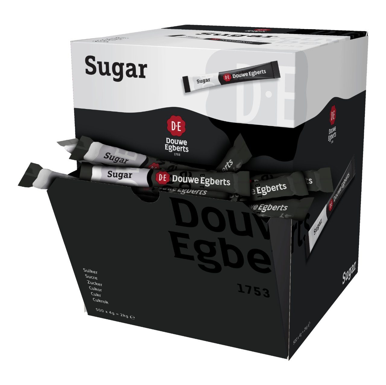 De Douwe Egberts suikersticks met 4 gram fijne kristalsuiker worden geleverd in een handige dispenserdoos met 500 sticks.